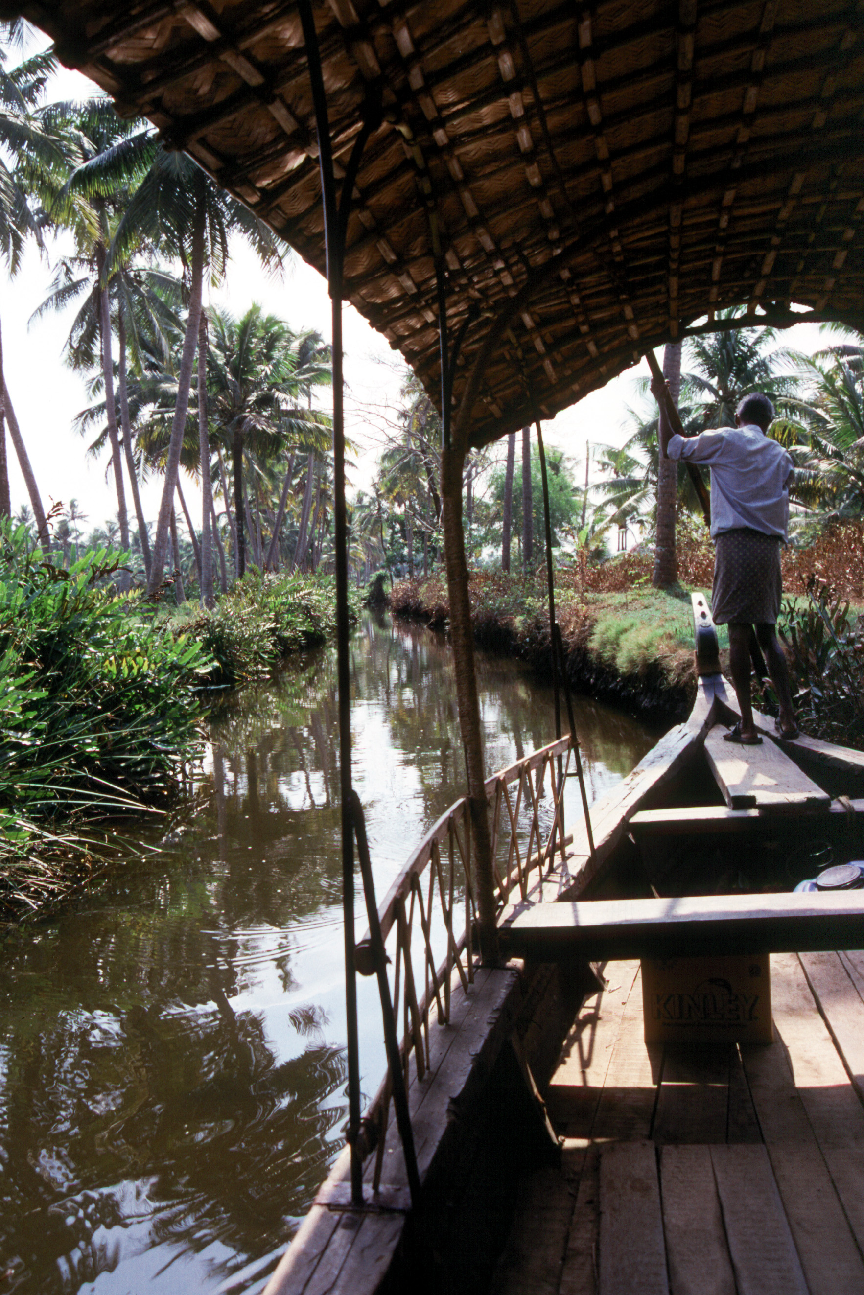 We had booked to go on a "backwater cruise" the evening before. This involved waking up at 0800 and getting a minibus about fifty kilometres south to a place just north of Vembanad Lake near Kottayam. The drive as always was fairly manic. When we finally got there we found a river on the banks of which waited a boat with a woven coconut leaf roof. Funnily enough the boat turned out to be a punt. Our guide, Praveen, sat and chatted to us whilst two other chaps punted us along various rivers and man made canals with 7m long bamboo poles. It was very relaxing as we had the boat to ourselves and the breeze off the water served to cool us down in the 35°C temperatures.