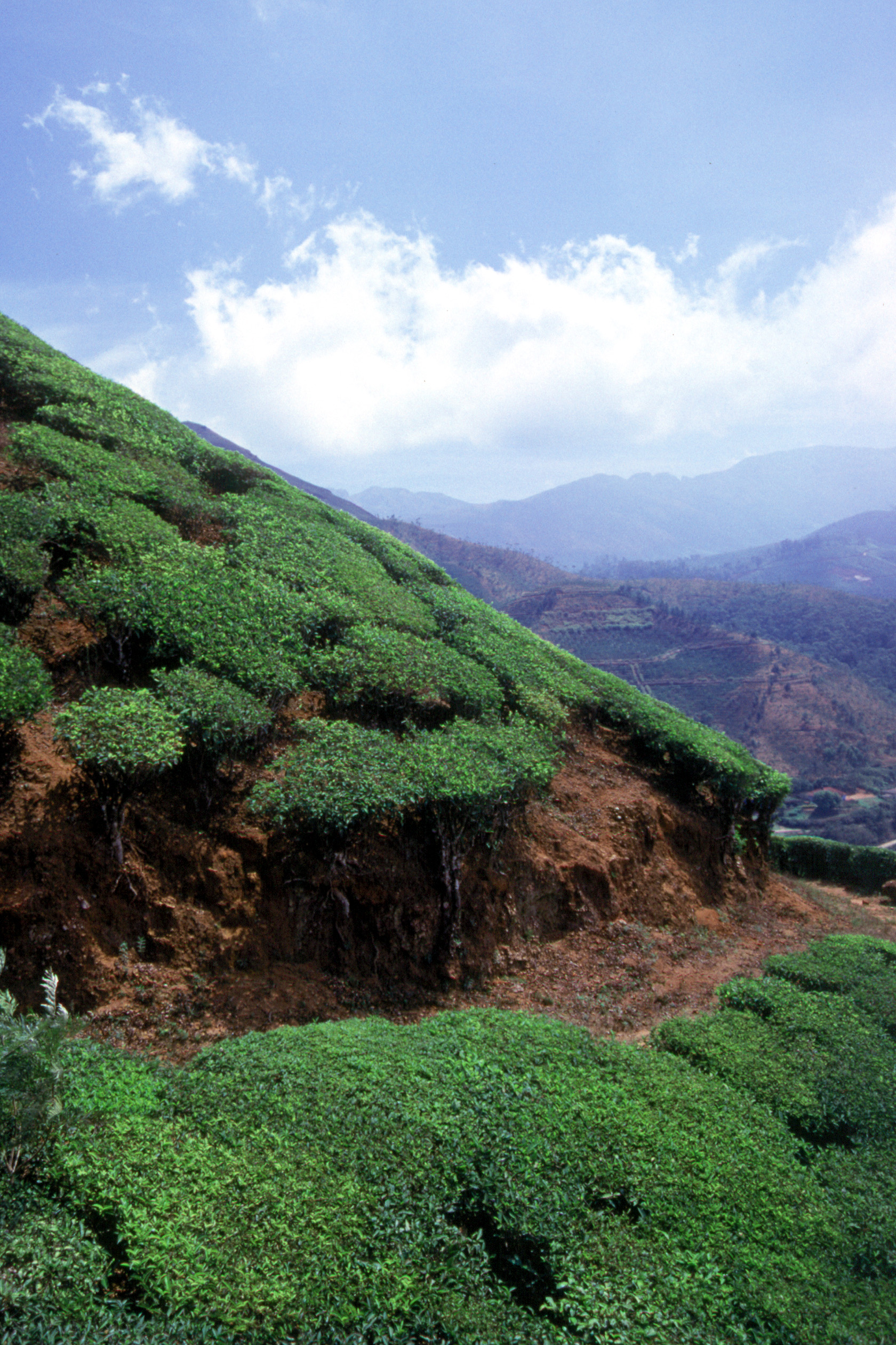 We left early-ish in the morning to head for the coolness of the mountains again. We had arranged to stop at Munnar, a tea plantation at an altitude of 1500m, midway between Kochi and Madurai in Tamil Nadu. We got on a relatively empty bus and had, for once, a fairly leisurely drive up. Again the scenery was breathtaking but especially the last few kilometres as the jungle gave way to an open expanse of tea bushes. Although I have seen pictures of tea plantations before I was not prepared for the sheer scale of it. Literally every slope was covered in row upon row of bushes and this neat arrangement gave the slopes an amazing texture.