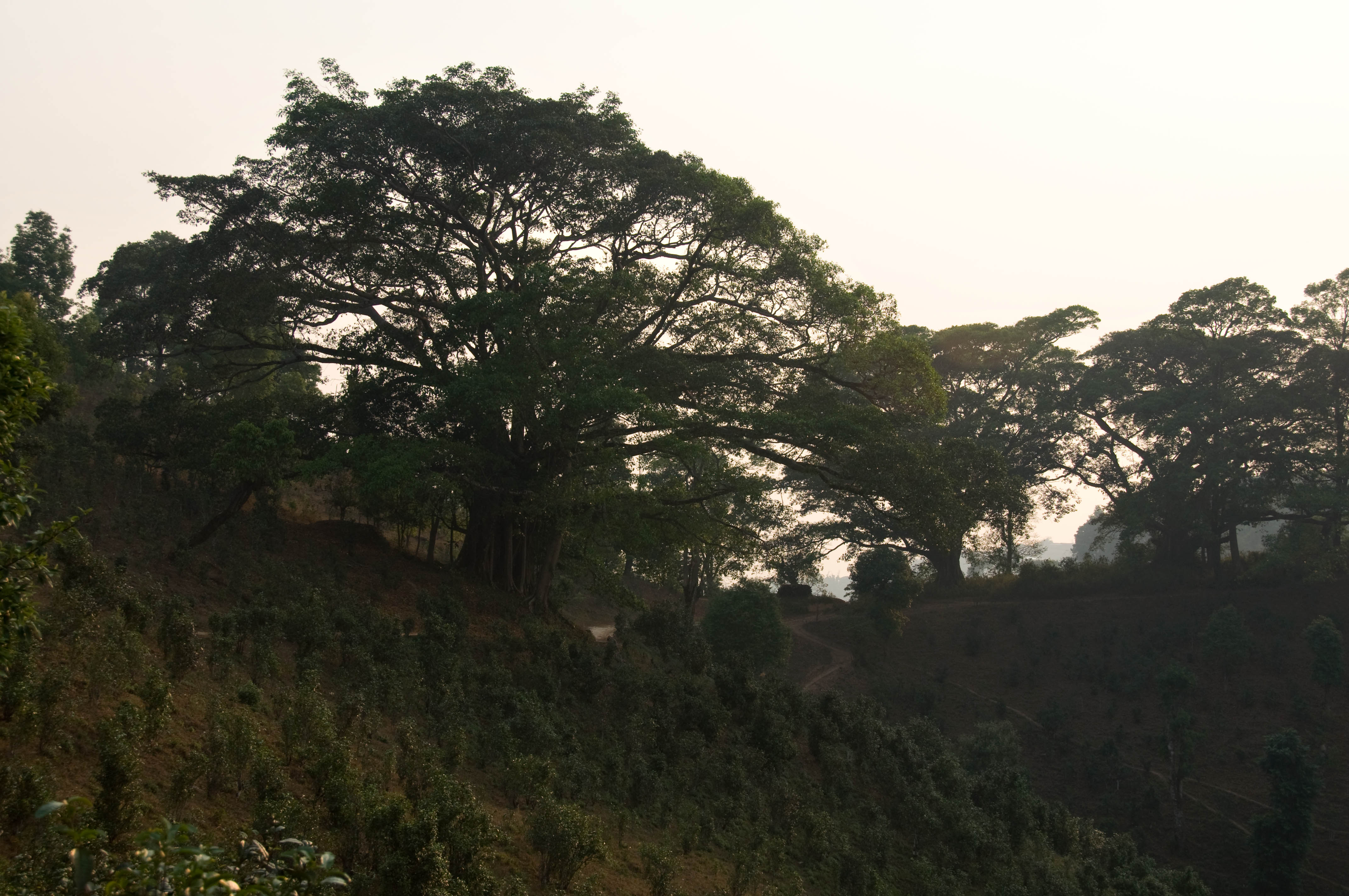 We then set off for Tangchan. This proved to be the best bit of the two days walking, we walked up by the town's Banyan tree and then in the late afternoon sun, the golden hour, traversed several ridges to reach the next village. The views were spectacular, looking over preserved tree filled valleys with only the occasional tea field interrupting the trees. The tea was quite unlike what you see in India. Rather than rows of close packed low bushes the tea plants were quite tall spindly things randomly dotted around the slopes. I was interested whether Sandy had considered using the Indian system on his fields, he did not know so I suspected for some reason it is not feasible.