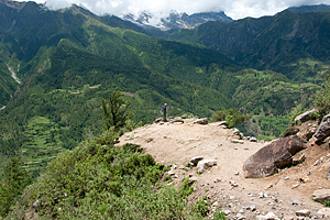 After Yari it took us about an hour to reach the campsite. As we got closer the effects of trying to modernise the valley hit us in the form of huge dust clouds being blown up from the partially constructed road which we had been following and was now zig zagging up the Nara La pass. When we finally got to the campsite about half way up the pass it was around 1500. It was a very dismal affair, a dusty ledge cut into the hillside with no clean water and only a good view to rescue it. Since the dust from the roads was swirling around the campsite we decided to do our usual trick and find a more restful spot. This was easy enough because as soon as we got off the main trail and into the scrubby vegetation the dust died off. We were able to find a grassy patch on which we could site, read and admire the view.