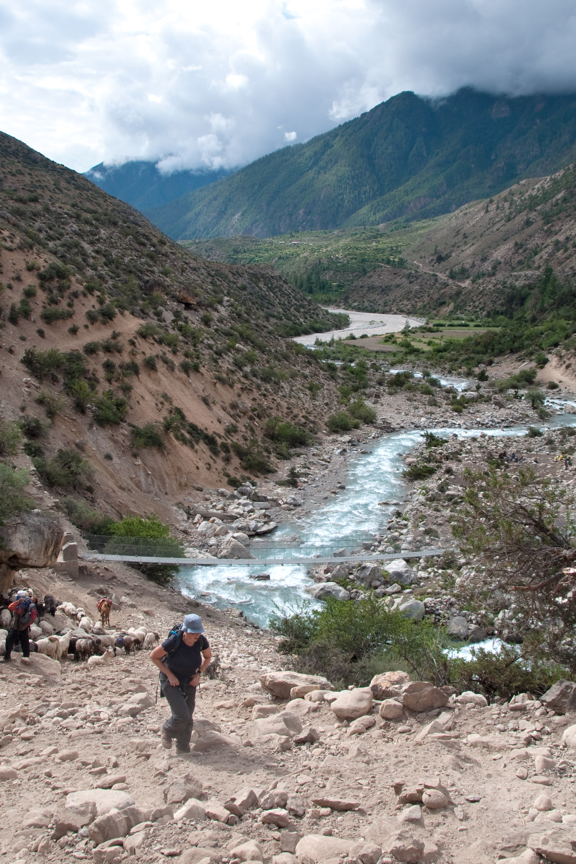 We woke up around 0630 and had breakfast, getting going around 0745. We were happy to start early as it meant we would get most of our trek done before the heat of the day. Whilst getting ready we stood and watched an endless procession of goats going across the box girder bridge opposite the camp. Walking out of Dharapuri we soon found ourselves just above an immense gorge cut by the Karnali. The path then took a turn for the dramatic as it became a rock cut channel in a cliff face suspended hundreds of metres above the river.
