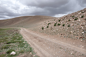 The pass was tough but not as tough as some we had experienced. It involved an ascent from 4100m to 4700m in the space of about two hours. The path was steep with a lot of dust, fortunately damp, and loose stones. However we slowly trudged to the top helped by the fact that it was overcast. We only stopped very briefly at the top and the descended. As soon as we got out of the clouds we had the most amazing views, the road itself had been scored through a landscape of barren eroded mountains. For about an hour we walked on ledges hacked out of vast landslides built up over centuries of winters and summers. Finally we got to a point where we could see the border and into Tibet itself.