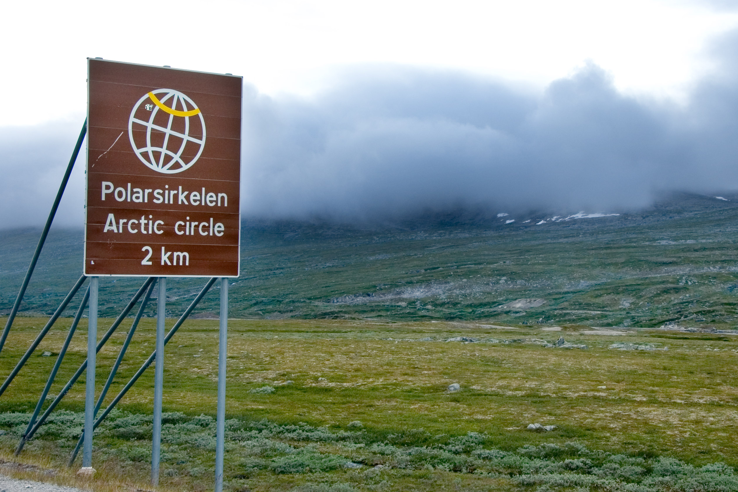 Having failed the day before we were determined to have a walk in the Saltfeljt National Park just North of the Arctic circle. We started off at seven and had the roads almost to ourselves. The scenery was stunning, as we approached the polar circle we ascended to a pass at the watershed of two valleys. It certainly looked the part, the vegetation was suitably Arctic tundra like and we had snow all around us. At the polar circle there was a peculiar tourist igloo selling a variety of tat and a variety of monuments to have your photo taken next to. We only stopped briefly and then drove a few km up the road to the start of our walk. It was not extensive, just 30 minutes along a track and back, as we had to catch a ferry in Bodo. However it was great to get out of the car and we ate our breakfast of smoked salmon and cream cheese rolls on a hillock overlooking a crystal clear arctic stream.