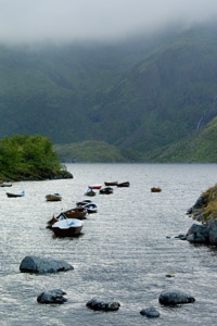 The approach to Moskenes, the southern most of the chain of islands, was magical. The sheer mountains first loomed out of the mist and clouds and only slowly did it become apparent that there was a small village nestling at the foot of the cliffs. We disembarked and drove ten minutes own the road to the tiny fishing village of Å where we were to stay for the next couple of nights.