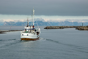 At 1030 we walked down to the docks to meet Morten, a fisherman who takes tourists out on his ship for fishing and sightseeing. This turned out to be quite a trip but not for the reasons I had been expecting. One of the key reasons for coming to the Lofoten was to see the Moknestraummen, the original Maelstrom which Edgar Allen Poe had written about in his short story "A Descent Into the Maelstrom" which I had read as a young boy. However it turned out when we drove through it that we were really there at the wrong season and no even when the tide was at its highest so it was not that spectacular. The phenomenon is caused by a ridge at 50m depth, either side of which plunges to 200m. The currents meet at the change of the tide causing the sea to boil and vortexes to form. however not that day, instead it was relatively flat with some disturbingly still patches of water in between rough ones.