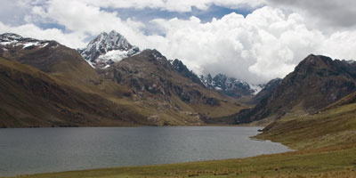 The trip to Chavin was well worth putting up with the guide for. We travelled back along the road towards the pass by which we had entered the valley, the Callejon de Huaylas. In one place the Rio Santa had completely inundated the road and they let us out to take some photos. Then we turned off the road heading east up into the mountains, We first worked our way across an immense swathe of open grassland and then started working our way up a mountain stream. After a while we got to a Lake Querococha , surrounded by black snow dusted peaks, where we were once again let out for photos.
