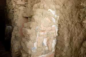 Although rain is infrequent El Nino events generally result in rainfall every decade and, even more rarely, severe flooding. The effects of this erosion can be seen on the unexcavated Huaca del Sol. However luckily the Moche had the tradition of rebuilding their temples every generation and did so by adding a new layer over the top of the old one. Thus although the last layer of building has been destroyed, by peeling back the layers archaeologists have been able to reveal amazing painted bas relief of the earlier layers.